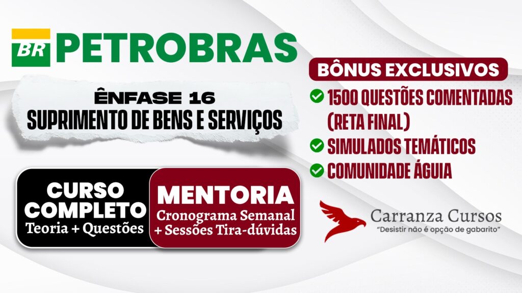 1 Noções de Administração: 1.1 Planejamento (Estratégico, Tático e Operacional) 1.2 Administração da Qualidade 1.3 Gestão por Processos 1.4 Atendimento ao Cliente 2 Conceitos de Logística e Gerenciamento da Cadeia de Suprimentos: 2.1 Gestão de Compras 2.2 Estratégias de Negociação 2.3 Seleção e Avaliação de Fornecedores 2.4 Gestão e Fiscalização de Contratos 2.5 Sustentabilidade na Cadeia de Suprimentos 2.6 Gestão de Transporte de Cargas 2.7 Gestão de Estoques e Almoxarifados BLOCO II: 2 Legislação 2.1 Artigos 28 a 91 da Lei 13.303/16 (Estatuto jurídico da empresa pública, da sociedade de economia mista e de suas subsidiárias); 2.2 Regulamento de Licitações e Contratos da Petrobras – RLCP BLOCO III: 3 Noções de Contabilidade e Tributário 3.1 Conceitos, Objetivos e Finalidades da Contabilidade; 3.2 Receita, Despesa, Custos e Resultados; 3.3 Administração Tributária